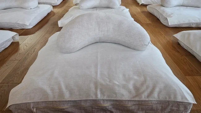 Blankets and comfortable, custom-made meditation mats, cushions to support the body during the practice. We use walls for back support or chairs if needed.